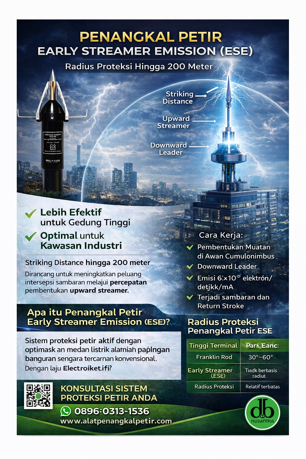 Dalam kondisi badai tropis Indonesia dengan frekuensi sambaran tinggi, pendekatan berbasis fisika medan listrik dan model elektrogeometrik menjadi standar dalam desain sistem proteksi modern. Pemahaman detail mengenai intensifikasi medan dan mekanisme upward streamer menjadikan Penangkal Petir Early Streamer Emission (ESE) sebagai solusi yang relevan untuk kebutuhan proteksi bangunan skala kecil hingga kawasan industri luas menggunakan Penangkal Petir Early Streamer Emission (ESE).